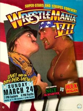 WrestleMania VII…..did Vince think we were stupid? I generally believe that in the long view, Vince knows what he’s doing better than us laymen. But in the short run, like anyone else, he’s had his share of brain farts. This was one of them. Wrestlemania VII, dubbed Superstars and Stripes Forever, was a blatant, jingoistic attempt to capitalize on the more patriotic mood that was afoot due to the Gulf War. All the usual WrestleMania decor was changed to red, white, and blue like so: