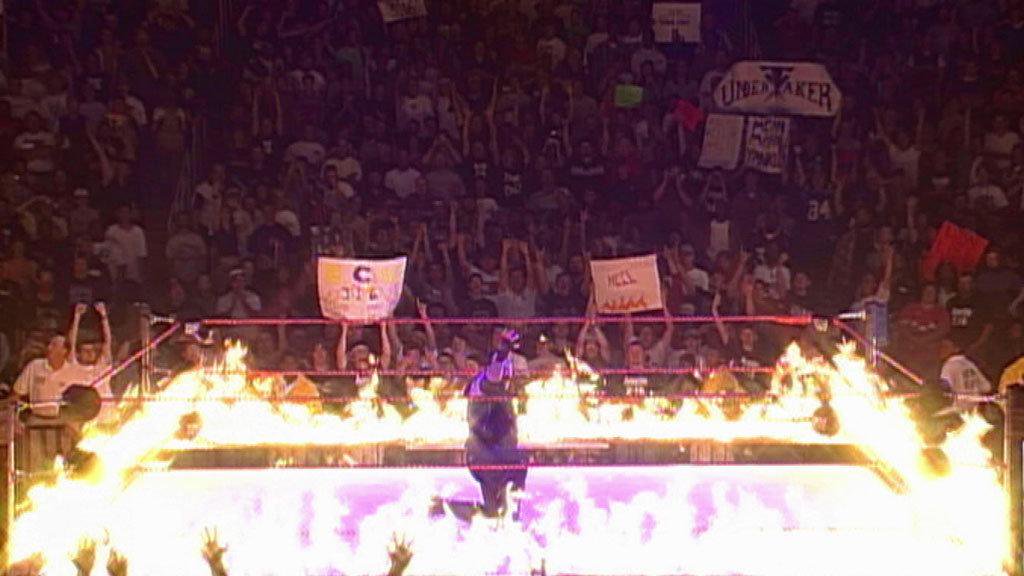 The effects made for a more compelling match than their WrestleMania encounter; this match wasn’t bad even with the stupid premise. Anyhow, late in the match Kane manages to get through the ropes without getting burned and tries to bail only to be forced back to the ring by Vader. Taker does a spectacular tope to the floor and takes out both men, and the fight goes into the bandstand area. Seeing that alone should reinforce the sentiment that Taker needs to stay retired. When he was younger and could move it was like night and day compared to now.