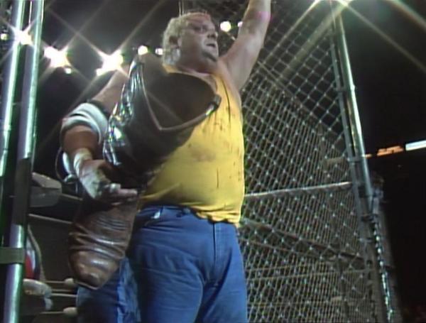 This match had eight people in it – Rhodes, Luger, Ivan Koloff, the Powers of Pain (Barbarian and Warlord), Road Warrior Animal, Tully Blanchard and Arn Anderson. It was a battle royal inside a cage, so you had to either throw someone out over the cage wall or through the door. Like so many of these NWA specialty matches the guys involved and the crowd popping for them made up for an absurd premise of a match. Seriously, trying to make sense of how you’d get someone in position to throw them over the wall of the cage is enough to make you want to throw the whole thing out. But here you had some of the biggest acts in the company – Dusty, Arn & Tully, Lex, and Animal – so there was plenty of heat from the crowd for was essentially a punch and kick match with some theatrics thrown in (and some bionic elbows from Dusty of course), which made it entertaining enough. The heel-face dynamic was weird in that it was lopsided five to three, and they kept the heel vs face thing up as the match went on so there were some spots where one of the heels was knocked down so that it wouldn’t be one big beat down by the bad guys.