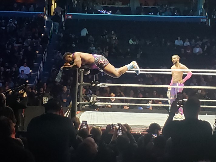 Fun opener. Big E is truly as hilarious in person as on TV. From the dancing to laying across the turnbuckles like below, the man loves to have a good time and it’s infectious.