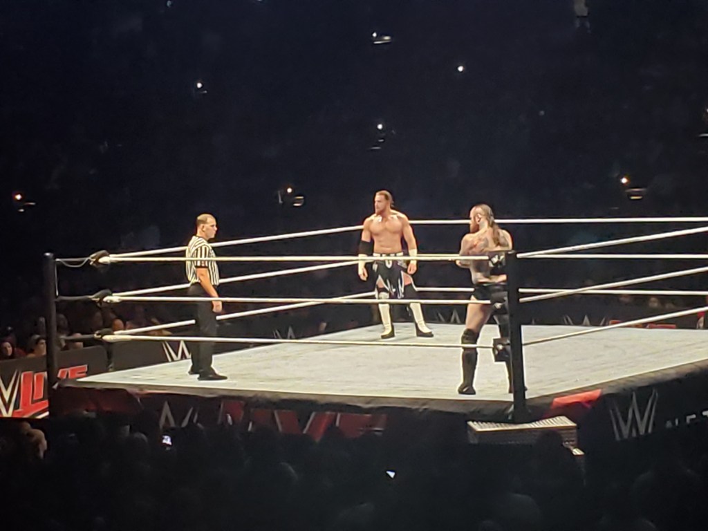 A hot opener to start things off. Montez Ford is another guy who is perfect for house shows; he gets the crowd hyped and he’s funny as hell when he dances to other teams music and mocks their mannerisms. He and Angelo Dawkins have a good time out there and it’s infectious. Gallows and Anderson got good heat from the crowd; they’re another act that is better at working the people in the building than they appear on TV. The match itself was essentially a preview of the one that happened recently on Monday Night Raw, down to the cartwheel sequence between Ford and Ivar of the Raiders. Everyone did good work and it was an excellent way to start the show.